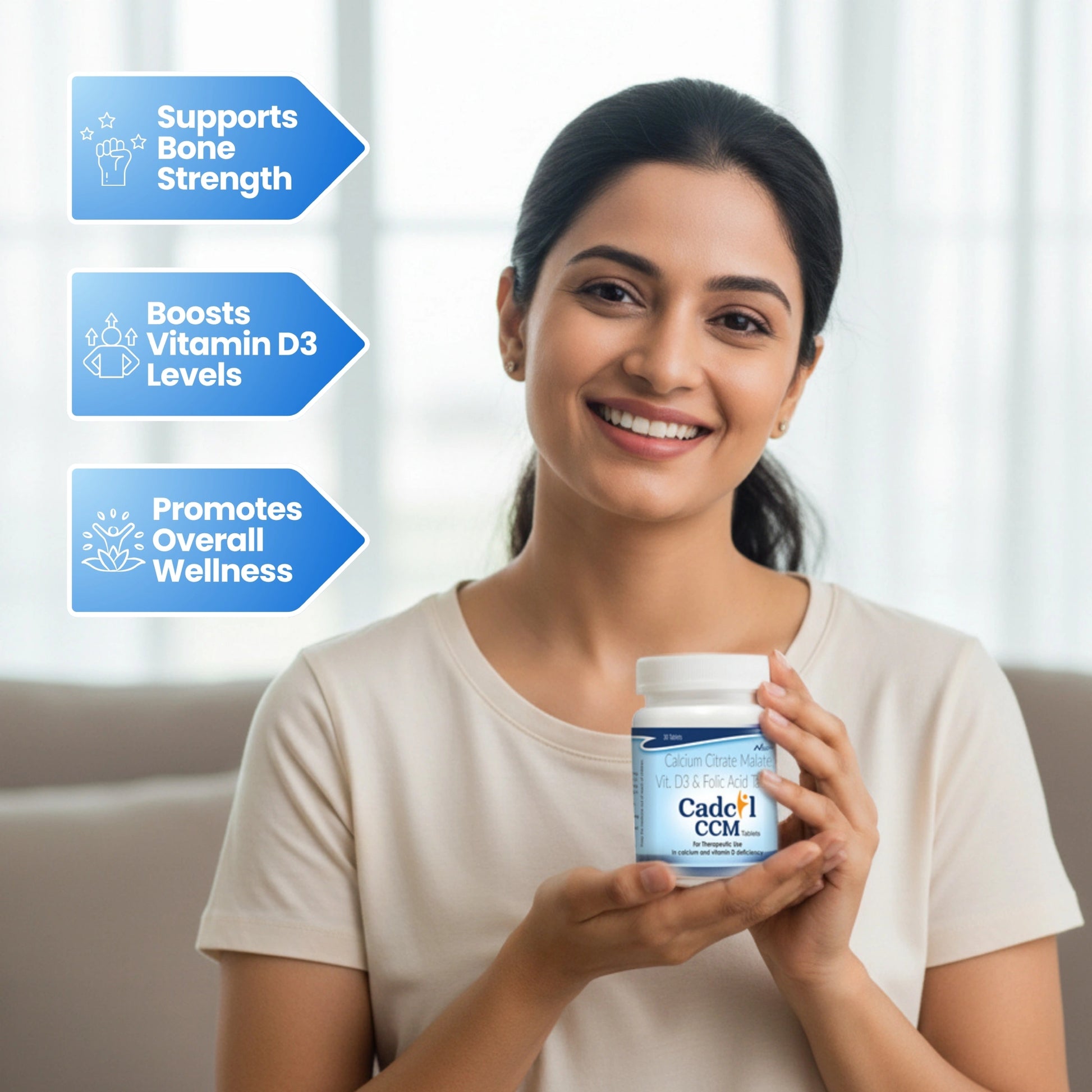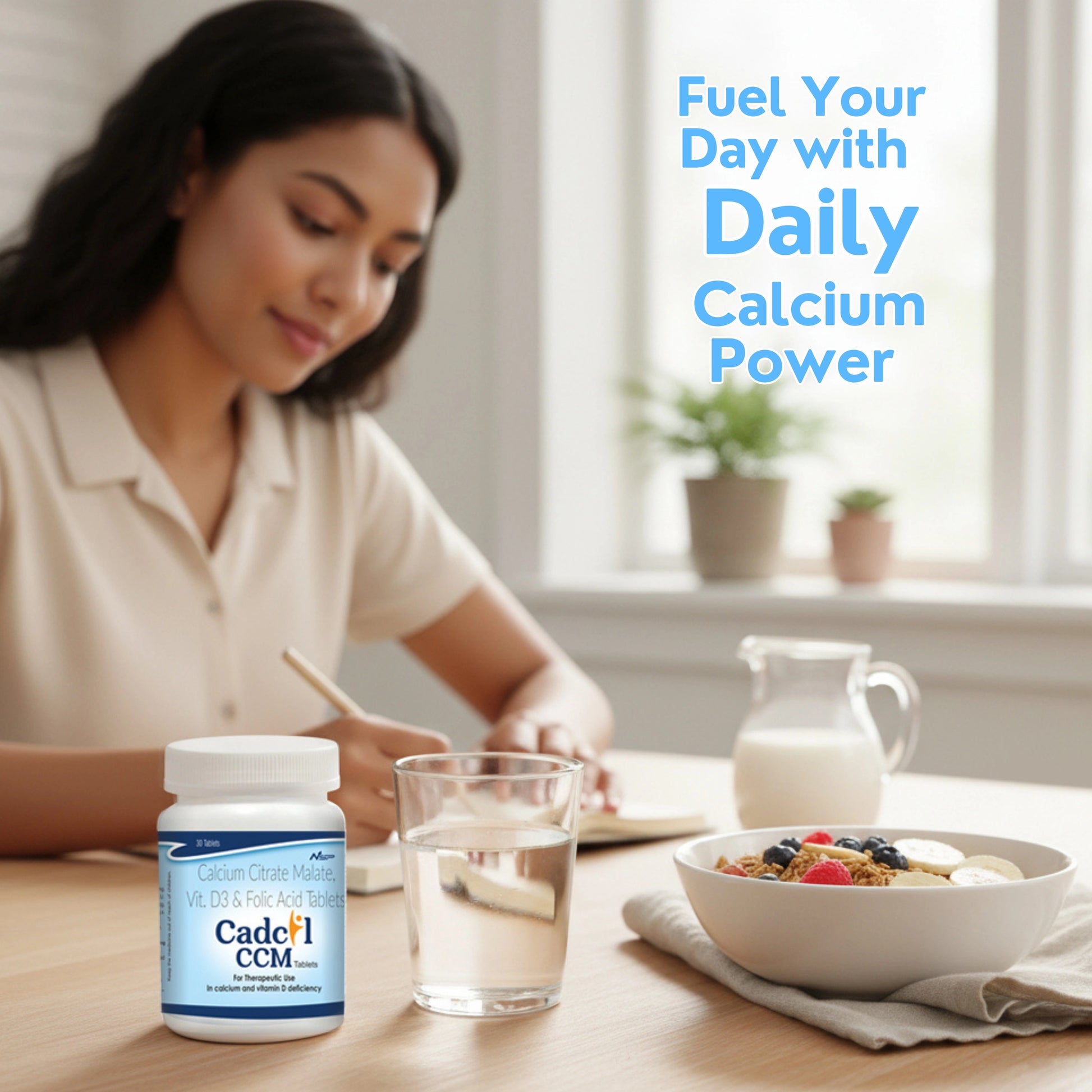 A complete bone and muscle health supplement containing Calcium Citrate Malate, Vitamin D3, and Folic Acid. Cadcil CCM helps strengthen bones, improve calcium absorption, and support nerve and muscle function — ideal for daily therapeutic use in calcium and Vitamin D deficiency.